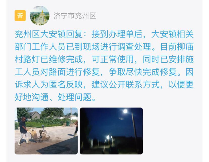 收到留言后,济宁市兖州区办理并回复:大安镇相关部门已到现场进行调查处理。目前柳庙村路灯已维修完成,可正常使用。同时已安排施工人员对路面进行修复,争取尽快完成修复。