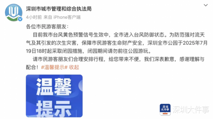 目前我市台风黄色预警信号生效中,全市进入台风防御状态。为防范强对流天气及其引发的次生灾害,保障市民游客生命财产安全,深圳全市公园于2025年7月19日18时起采取闭园措施,闭园期间请勿前往公园游玩。